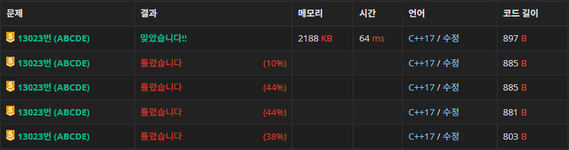 4. 문제에서 요구하는 친구 관계가 존재하는지를 판별할 bool exist는 reps가 4가 되면 true가 된다
